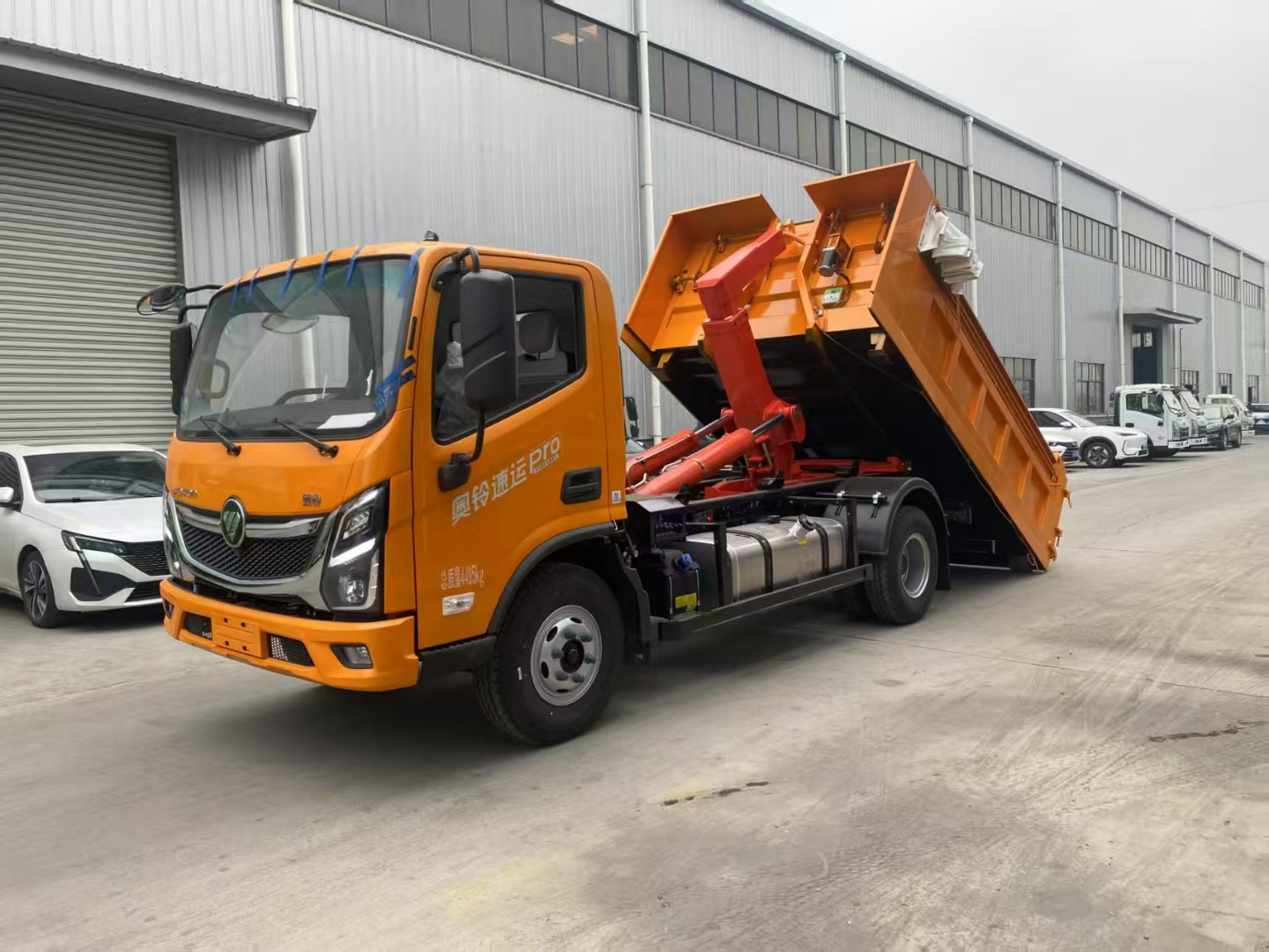 Configuration:福田奥铃速运Por勾臂式自卸车,4x2,蓝牌,国六,康明斯172马力发动机,法士特8JS85TE加大变速箱,860车架,220直通6毫米大梁,825轮胎 。 上装配置:伸缩臂,主油缸175,油缸座铸造件,高强度钢附架,大臂采用型材激光切割成型,带液压支腿,采用国产知名品牌泵,中梅多路阀,带横向锁紧,无线遥控器,静电喷粉烤漆工艺。