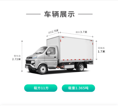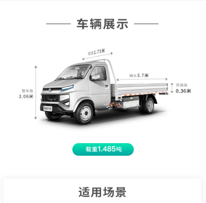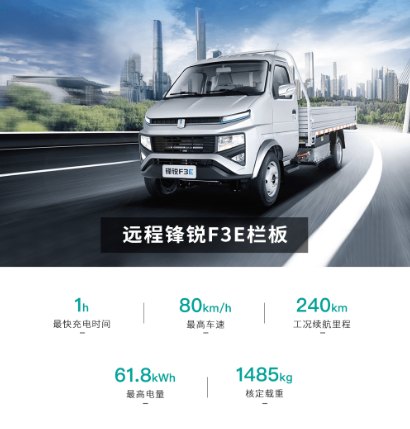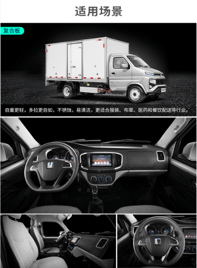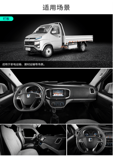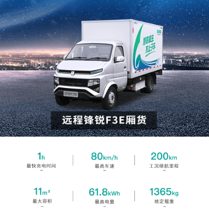 Configuration:参数 车辆类别:微卡 技术路线:纯电动 车辆型号:锋锐F3E 准乘人数:2人 货箱容积:1145-1485(kg) 货厢材质:复合板/刚瓦楞 电池品牌:宁德/亿纬 额定载质量:1145-1485(kg) 快充时间:1~1.5H 最高车速:80