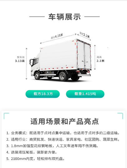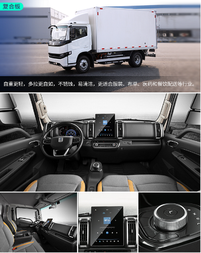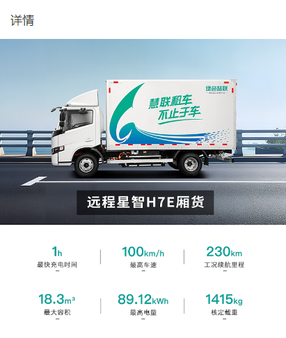 Configuration:参数 车辆类别:轻卡 技术路线:纯电动 车辆型号:星智H7E 准乘人数:2人 长*宽*高:5995*2150*3130 货箱尺寸:4150*2100*2100 货箱容积:18.3m3 货厢材质:复合板 电池品牌:宁德时代 电池类型:磷酸铁锂蓄电池 电池电量:89.1 额定载质量:1415 快充时间:1~1.5H 最高车速:100