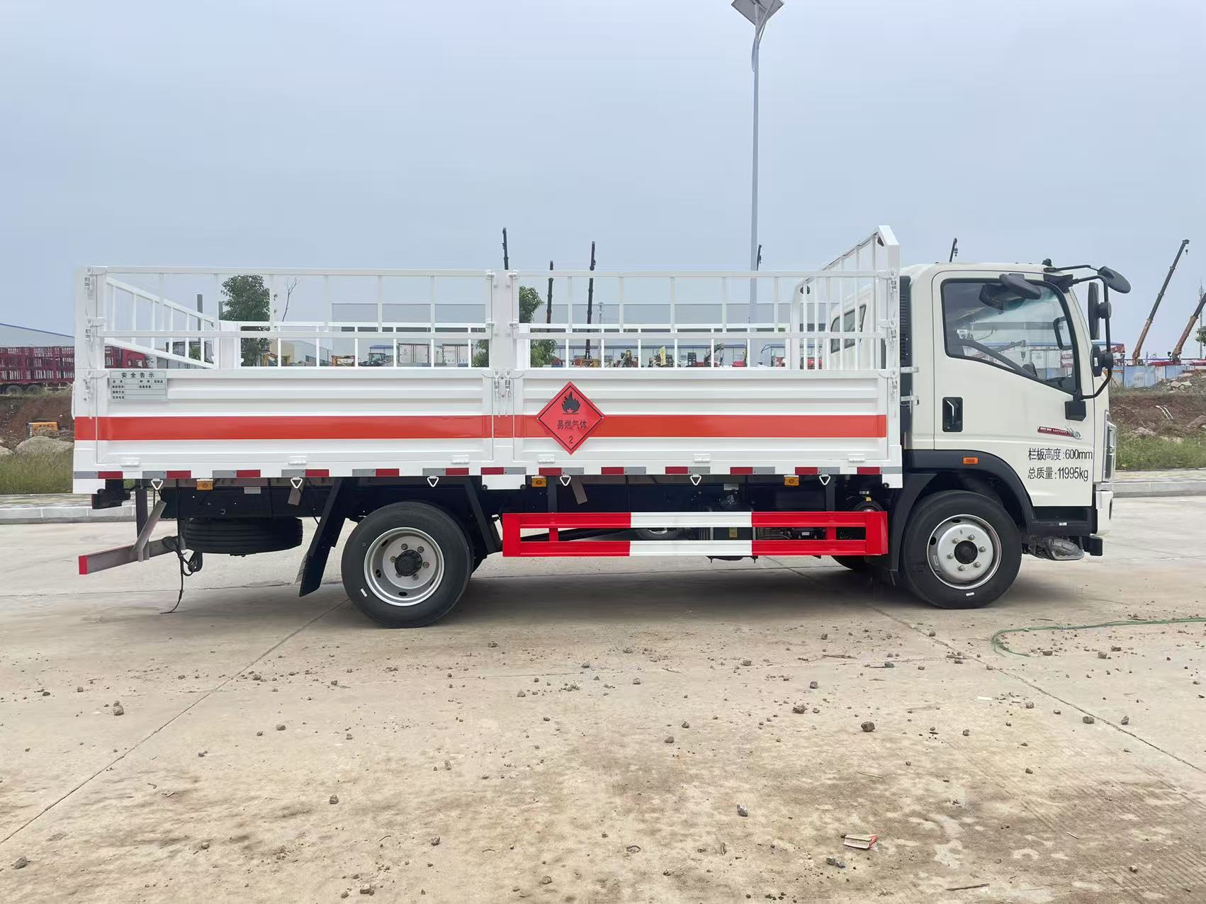 Configuration:豪沃悍将2080豪华中体驾驶室,国六,潍柴160马力,轴距3800,万里扬6档变速箱,245/70R19.5 16PR轮胎,多功能方向盘,半包围驾驶室内饰,双预警,定速巡航,液晶仪表盘,带中控、电窗、皮座椅、气喇叭、全包裹、车钥匙远程遥控玻璃升降。 上装配置:底板采用3MM花纹板,边板1.5MM,随车配备,手提灭火器,静电胶皮,危险品三角顶灯,防护帽等,底梁间距30公分,严格按照国家危险品法规进行“易燃气体”标识粘贴等。厢体尺寸:5200,×2300,2400×600,总质量:11995kg
