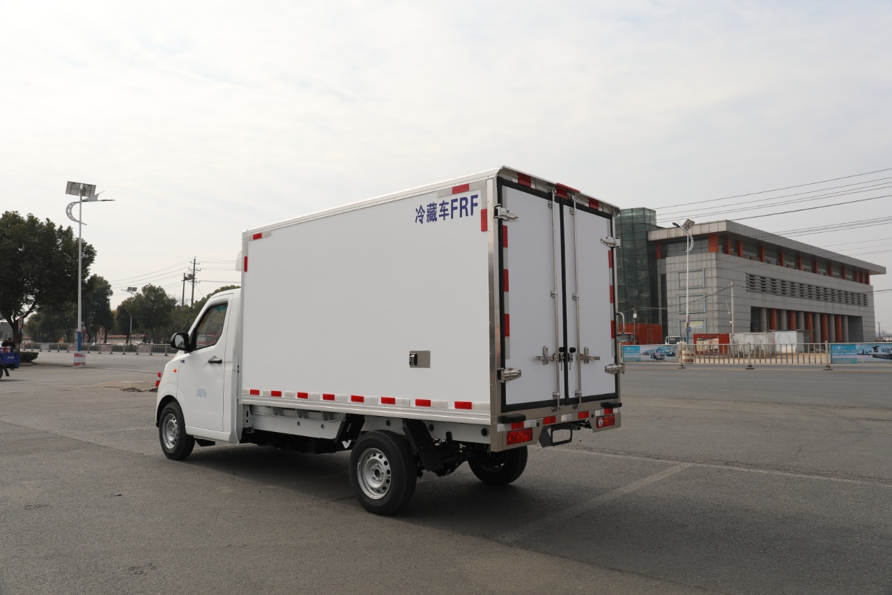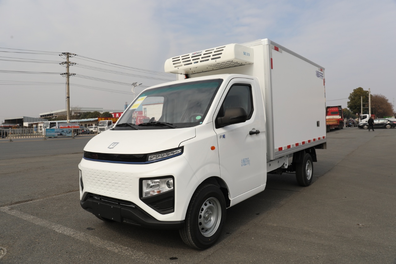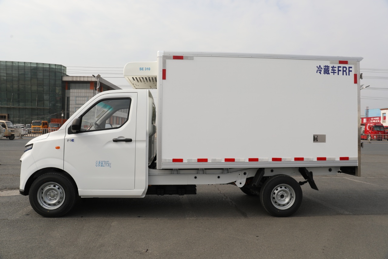 Configuration:吉利 F1E纯电动冷藏车25款(小微卡) 总质量2995Kg, 整备质量1730Kg, 额定载质量:1135Kg, 轴距:3360 动力电池:吉利智芯电池46.08kwh。 续航里程:150-180公里 驱动电机:智芯电机30/70kw 轮胎:185R14LT 8PR 行车制动:液压制动、前盘后鼓. 配置:单排驾驶室、液晶仪表盘、倒车雷达、电动空调、电动门窗、中控门锁、日间行车灯、遥控钥匙USB+蓝牙、ABS、EBD、T-BXO。 冷藏系统:负18度冷机 质保期:8年40万公里。