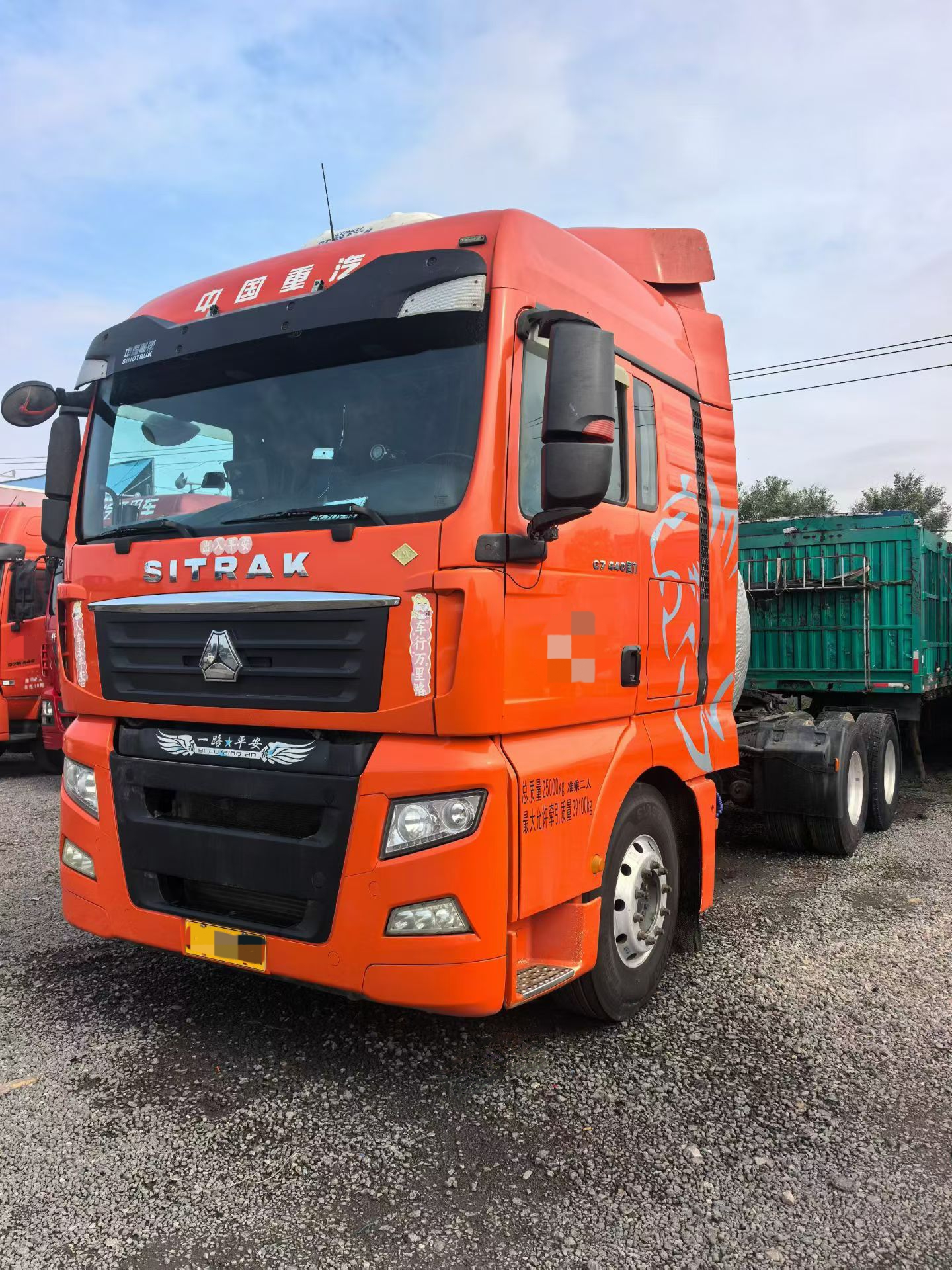 Configuration:20年7月,汕德卡G7牵引车,LNG,6x4,高顶驾驶室,国六,曼机440马力,16挡变速箱,液缓,1350L气瓶 ,铝合金车圈,带保险