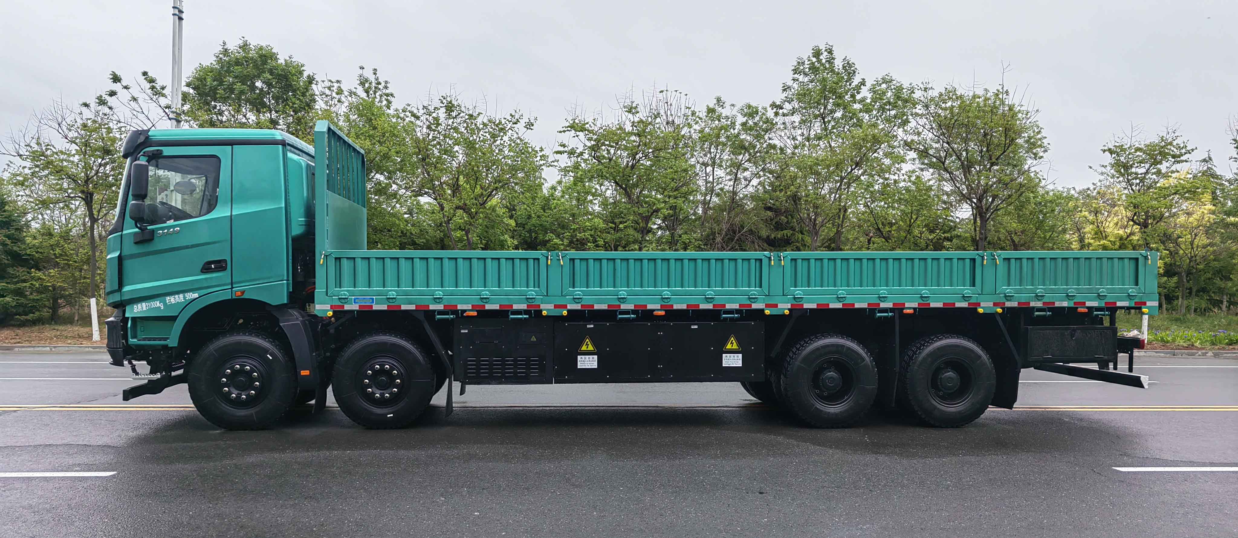 Configuration:北奔V3纯电动载货汽车,8x4,轴距:1500+5050+1450,V3中长驾平顶电动版(PLUS)驾驶室,特百佳TZ40STPG70电机,特百佳TS-0425C变速箱(无取力器),Z202H电液转向机,7.5吨前轴,13吨北奔双减桥,速比5.921,车架:901-761 317*75*8.5+7,12/12/13板簧,12.00R20 18PR轮胎,亿纬电池, 400.61度电,栏板上装,货厢尺寸:9500*2450*500